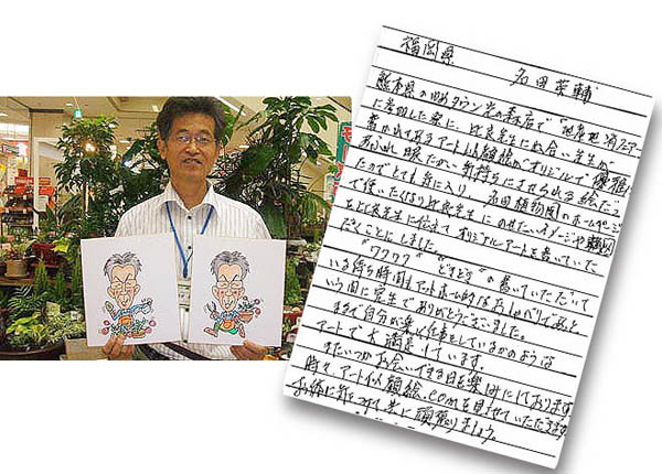 福岡県 名田植物園 名田英輔様より 熊本県のゆめタウン光の森店で「地産地消フェアー」に 参加した際に、比良先生に出会い先生が書かれてある アート似顔絵がオリジナルで優雅にあふれ温かい 気持ちにさせられる絵だったのでとても気に入り、 名田植物園のホームページで使いたくなり比良先生に、 載せたいイメージや構図を比良先生に伝えて、 オリジナルアートを描いて頂く事にしました。 ”ワクワク” ”どきどき”の描いて頂いている待ち 時間もアットホーム的なおしゃべりであっという間に 完成でありがとうございました。 まるで自分が楽しく仕事をしているかのような アートで大満足しています。 またいつかお会い出来る日を楽しみにしております。 時々、アート似顔絵.comを見させていただきます。 お身体に気をつけて共に頑張りましょう。 |